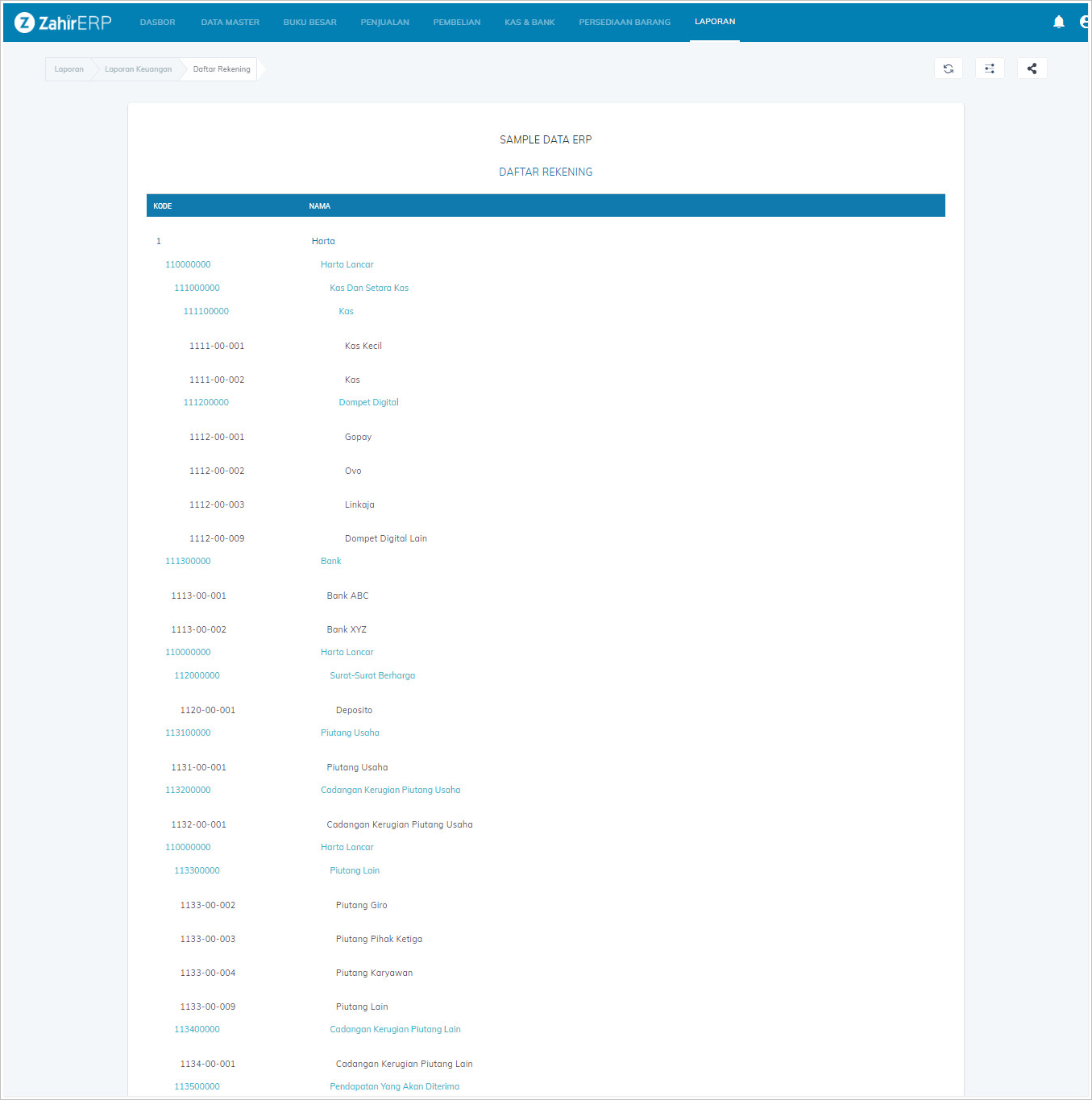 Untuk melihat daftar akun dalam bentuk laporan, bisa di lihat di modul Laporan > Laporan Keuangan > Buku Besar > Daftar Rekening. Hasilnya seperti gambar di bawah ini :
