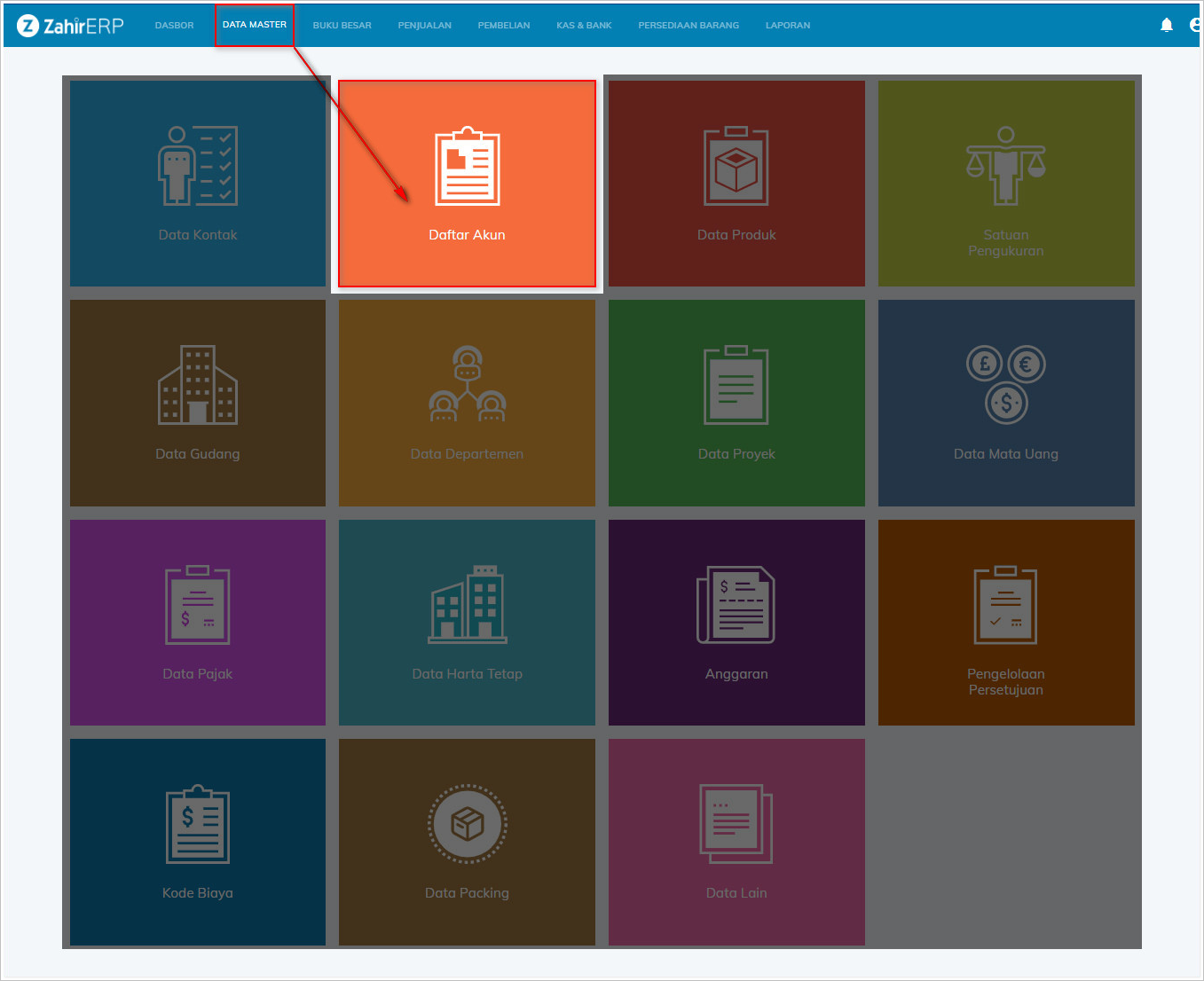 Untuk membuat Data Akun, klik modul Data Master > pilih Daftar Akun.