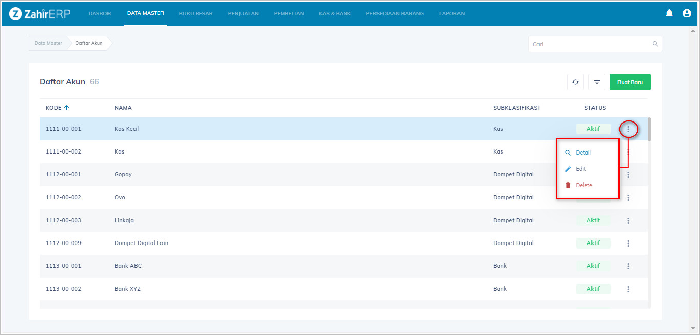 Untuk mengedit, menghapus dan melihat informasi detail kode akun rekening, klik modul Data Master > klik Daftar Akun > klik tombol fungsi di kanan pada baris setiap akun, seperti gambar dibawah ini :