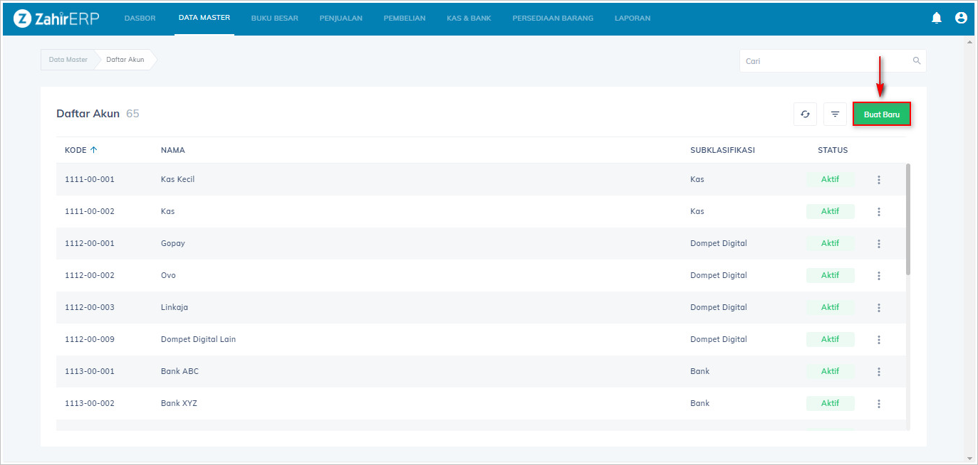 Kemudian akan tampil informasi Daftar Akun berupa informasi Kode, Nama, Subklasifikasi dan Status. Klik tombol “Buat Baru” untuk menambahkan data akun baru.