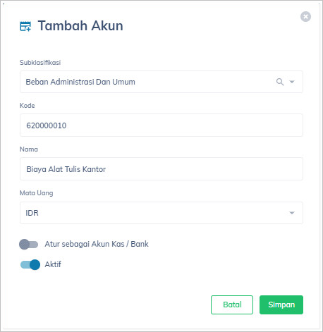 Catatan Informasi :Subklasifikasi : dipilih menyesuaikan nama akun yg akan dibuat. Jika subklasifikasi belum ada, Anda bisa membuatnya di modul master Data Master > Data Lainnya > Klasifikasi Akun.
