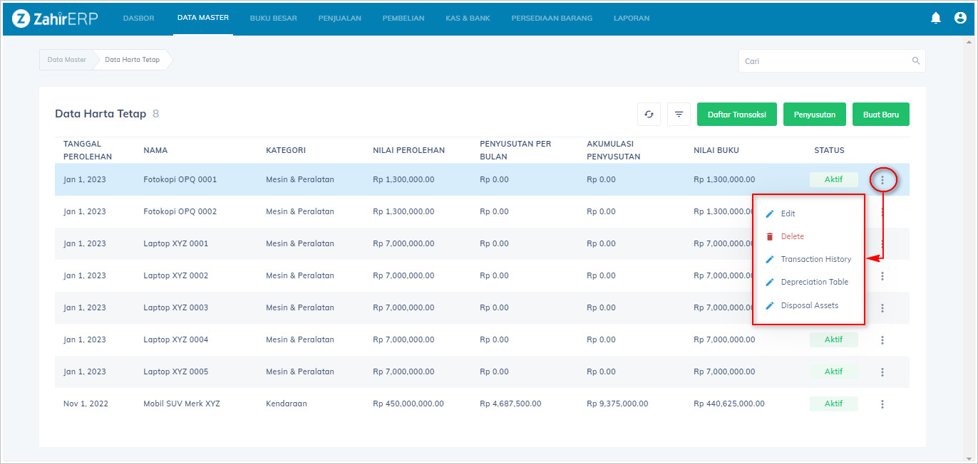 Untuk mengedit, menghapus, dan melihat informasi detail data harta tetap yang sudah dibuat, klik Data Master > pilih Data Harta Tetap. Kemudian klik tombol fungsi disebelah kanan dan Anda bisa memilih pilihan untuk dihapus atau diedit seperti contoh gambar dibawah ini :
