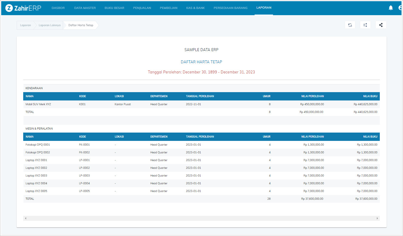 Untuk melihat laporan harta tetap, klik modul Laporan > klik Laporan Lainnya > Harta Tetap.