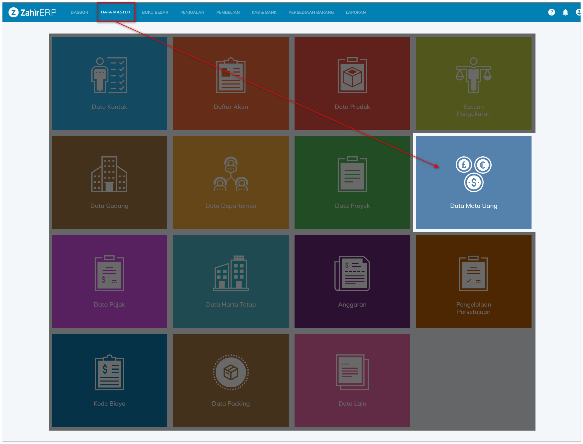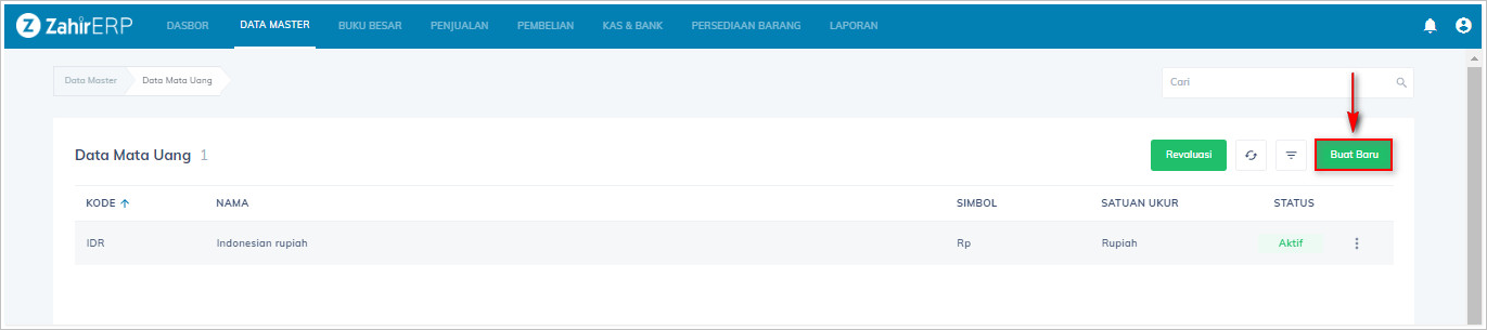 Untuk membuat Data mata uang, silahkan klik modul Data Master > pilih Data Mata Uang.