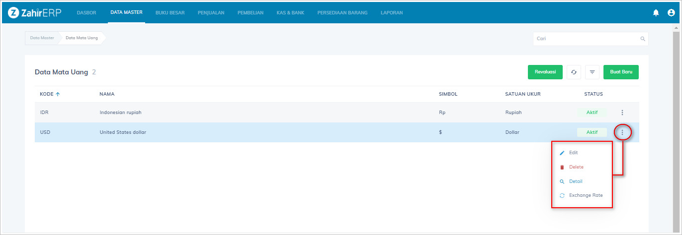 Untuk mengedit, menghapus dan melihat informasi detail data mata uang yang sudah dibuat, klik Data Master > pilih Data Mata Uang. Kemudian klik tombol fungsi disebelah kanan dan Anda bisa memilih pilihan untuk dihapus atau diedit seperti contoh gambar dibawah ini.
