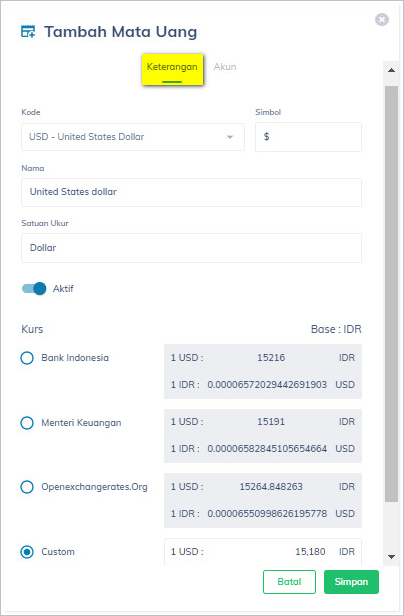 - Aktif : aktifkan opsi ini agar mata uang tersebut dapat digunakan/dipilih saat pembuatan data kontak, data akun maupun penginputan transaksi.