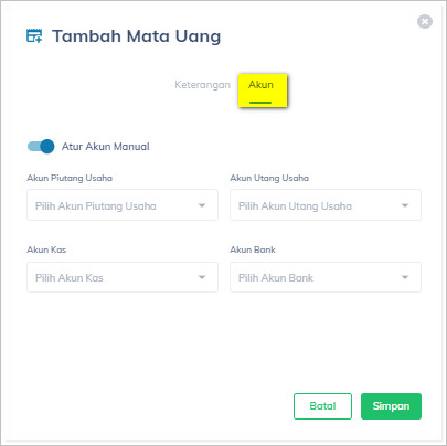 Atur Akun Manual : jika anda menonaktifkan opsi ini maka akun penting/kontrol secara otomatis akan dibuat oleh sistem. Namun jika anda mengaktifkan opsi ini maka anda bisa menentukan secara manual akun penting/kontrol yang ingin digunakan oleh sistem sebagai akun otomatis. Akun penting mata uang ini terdiri dari akun Piutang Usaha, Utang Usaha, Bank dan Kas.