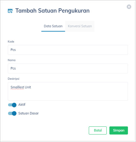Satuan Dasar : aktifkan opsi ini jika satuan yg Anda buat merupakan satuan dasar atau terkecil