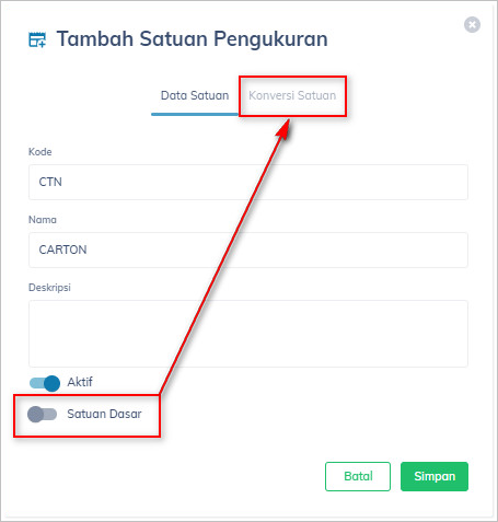 Contoh diatas adalah membuat satuan terbesar atau konversi satuan. ilustrasinya satuan Carton merupakan satuan konversi ke PCS. rianciannya 1 carton = 12 PCS. Artinya saat membuat satuan konversi, nonaktifkan opsi "Satuan Dasar" pada form tersebut. Sehingga Anda bisa langsung membuat pengaturan di “Konversi Satuan”. berikut ini contoh gambarnya :
