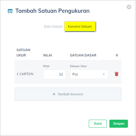 Tambah Konversi : Anda bisa membuat konversi lebih dari 1 untuk satuan ini.