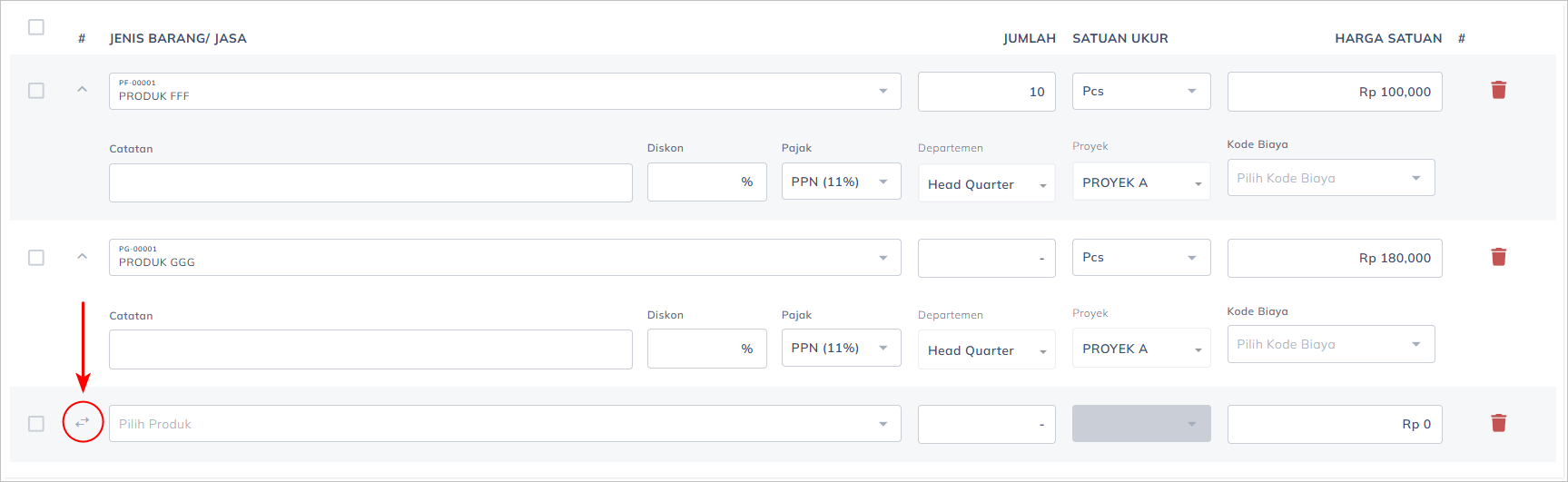 Jenis Barang / Jasa : Jenis/barang bisa disesuaikan dengan tombol switch disebelah kiri baris transaksi.
