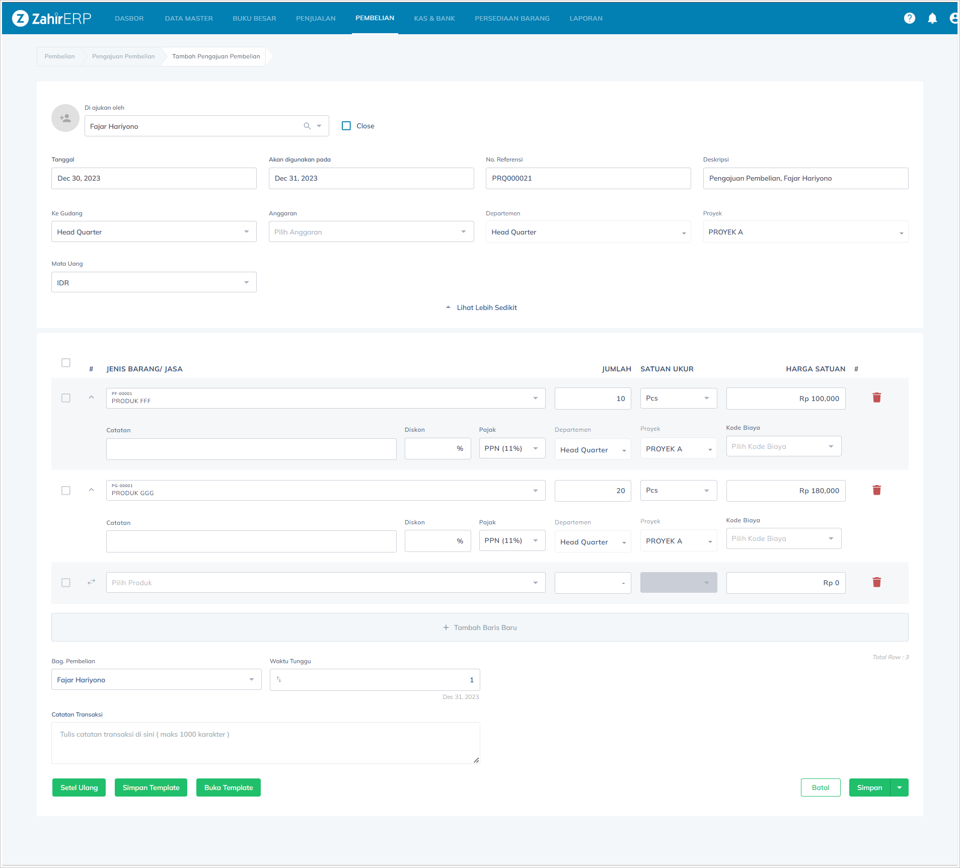 Apabila form pengajuan pembelian telah dilengkapi sesuai dengan kebutuhan, klik tombol "Simpan" untuk menyimpan transaksi tersebut kedalam daftar transaksi pengajuan pembelian. Berikut hasil transaksi yang sudah diinput.
