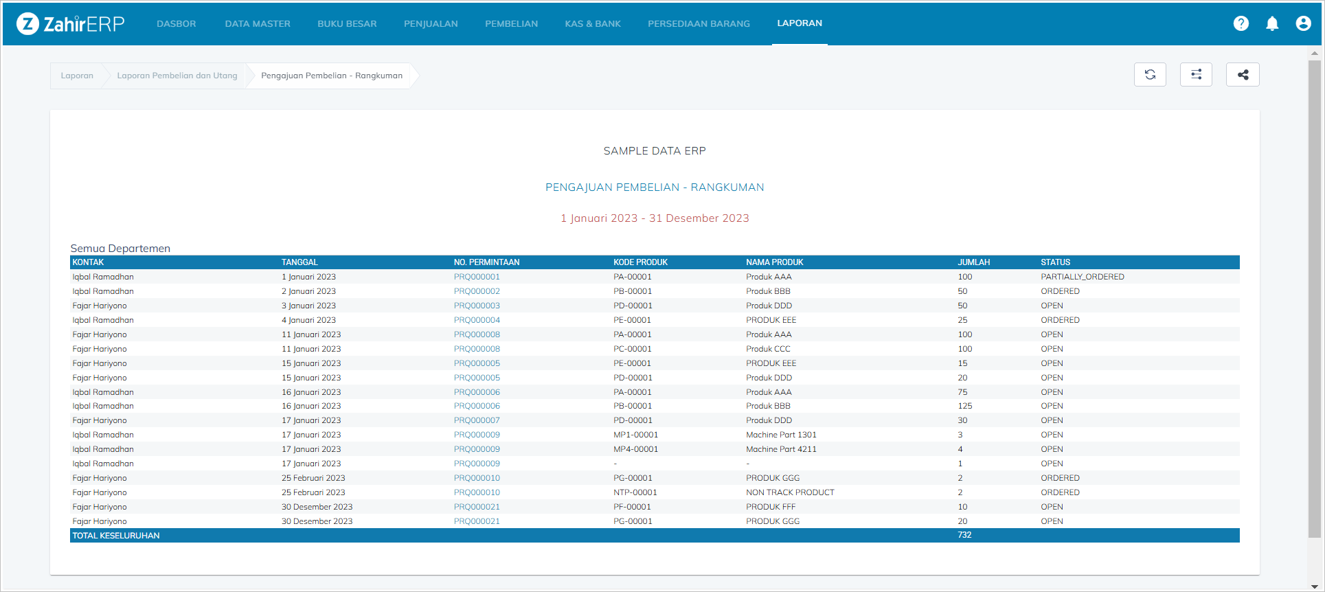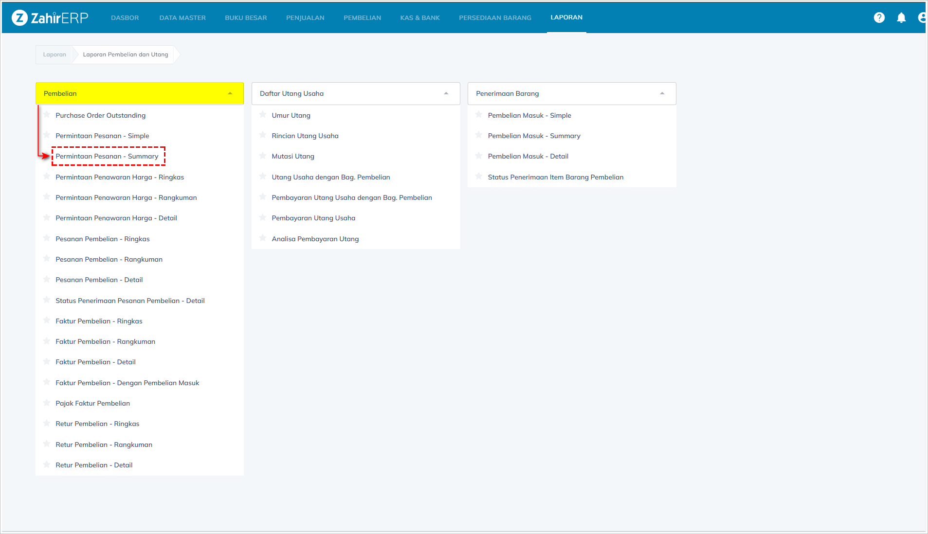 Laporan yang terbentuk dari transaksi tersebut dapat dilihat melalui, klik modul Laporan > Laporan Pembelian dan Utang > pilih Pembelian > kemudian pilih Permintaan Pesanan - Rangkuman.