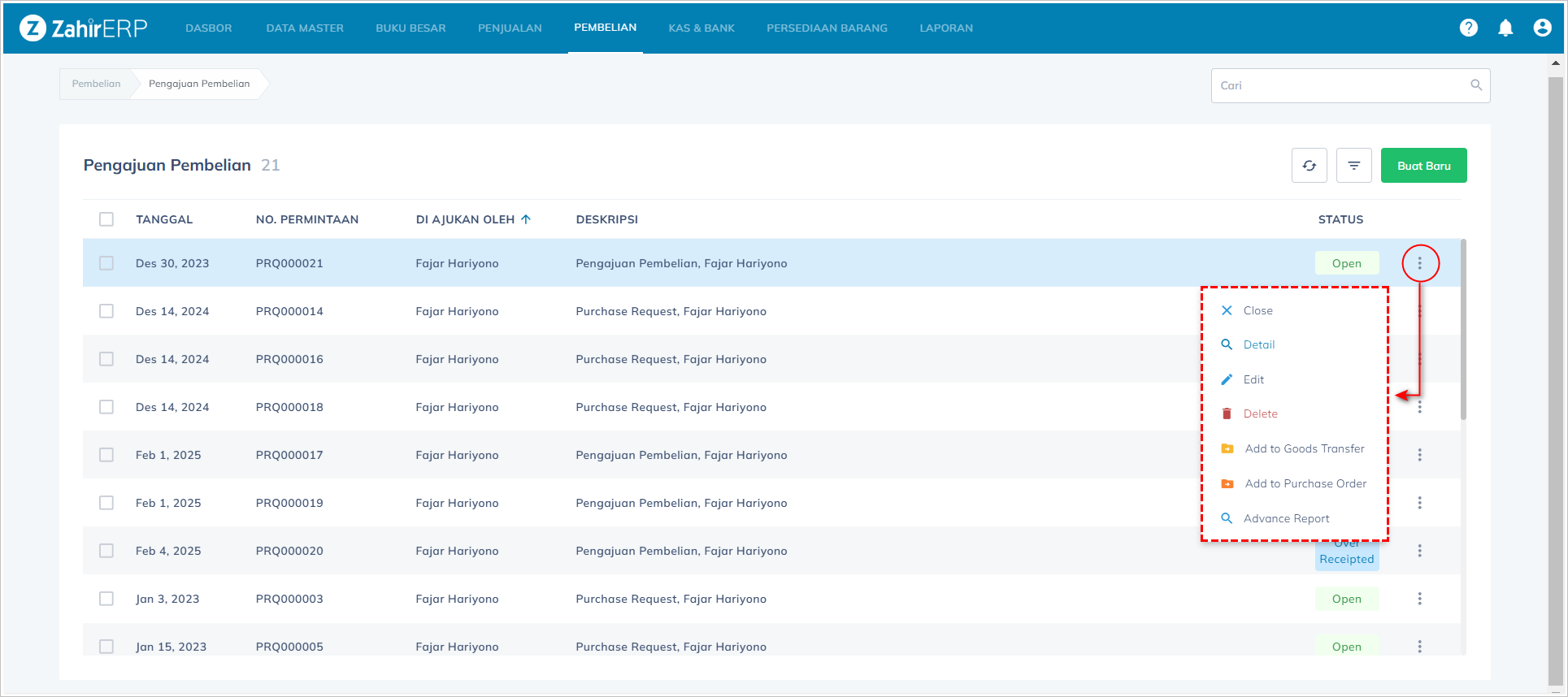 Untuk mencetak atau membuka detail transaksi, buka daftar transaksi pengajuan pembelian kemudian klik tombol fungsi / opsi disebelah kanan baris transaksi lalu klik Detail.