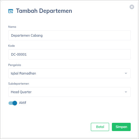 Selanjutnya akan tampil form "Tambah Departemen" seperti pada tampilan dibawah ini. Lengkapi form tersebut sesuai dengan kebutuhan.