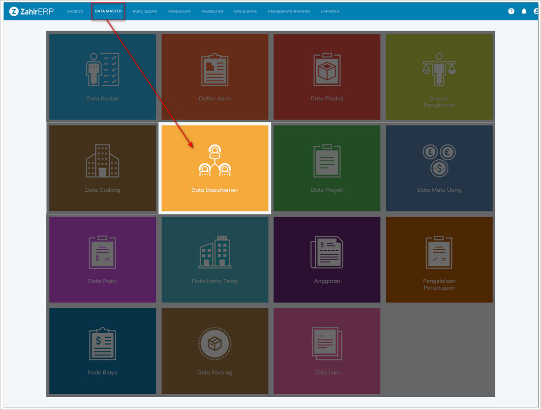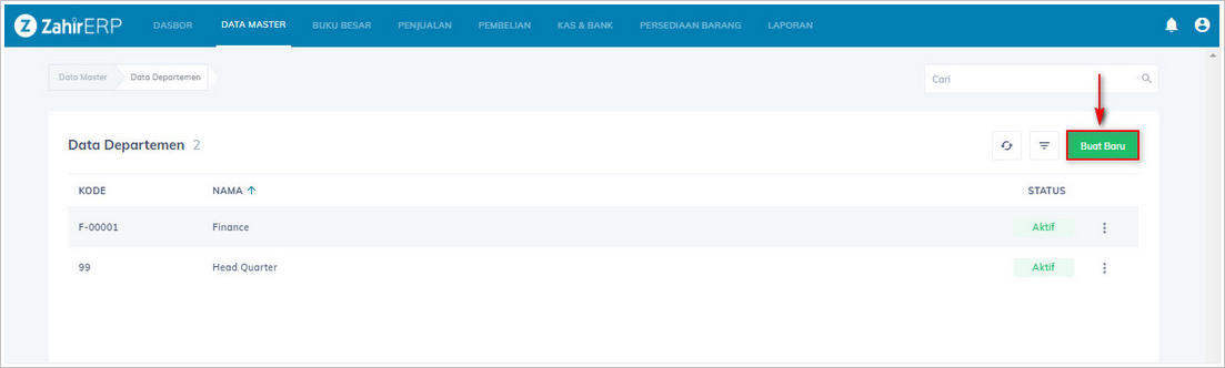 Untuk membuat Data departemen, silahkan klik Data Master > Data Departemen.