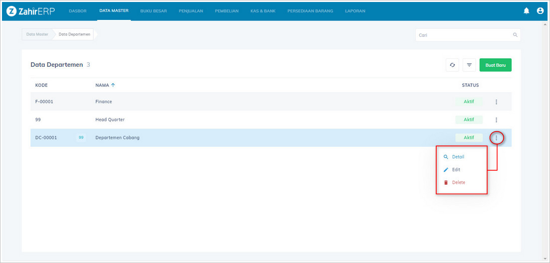 Untuk mengedit, menghapus dan melihat informasi detail data departemen yang sudah dibuat, klik Data Master > Data Departemen, kemudian klik tombol fungsi disebelah kanan dan Anda bisa memilih pilihan untuk dihapus atau di edit seperti contoh gambar dibawah ini :